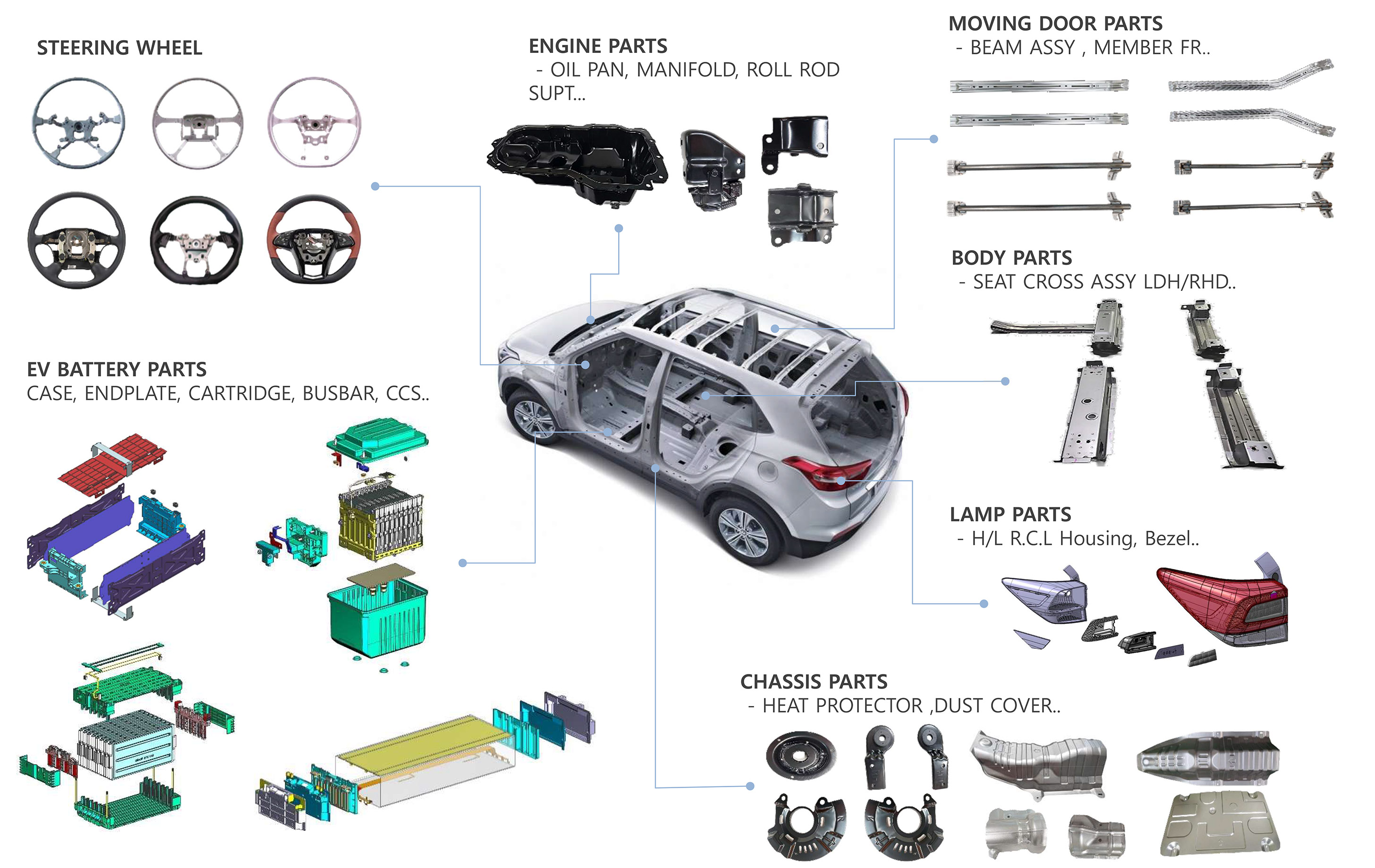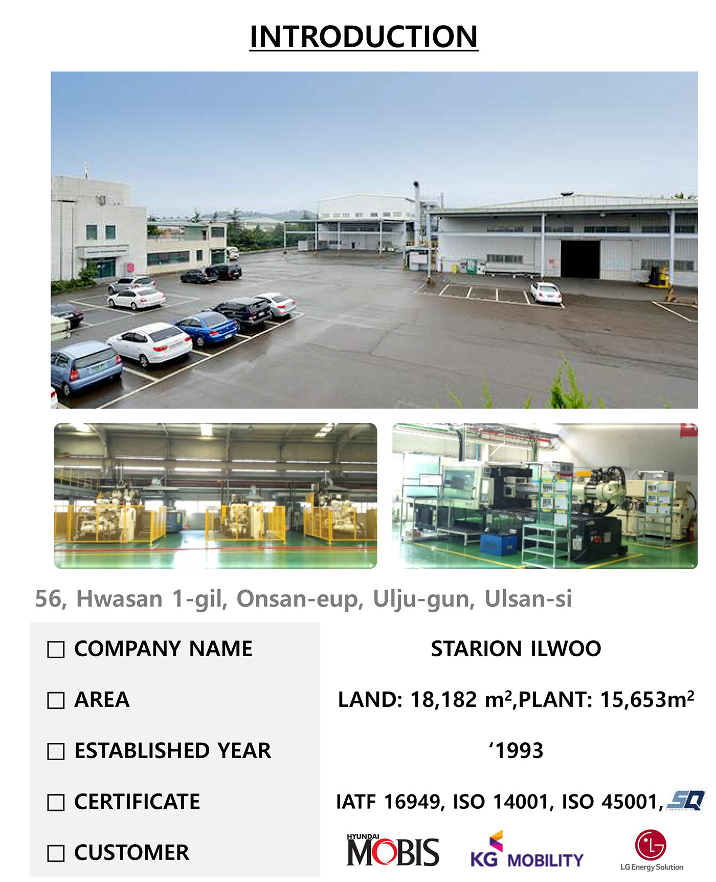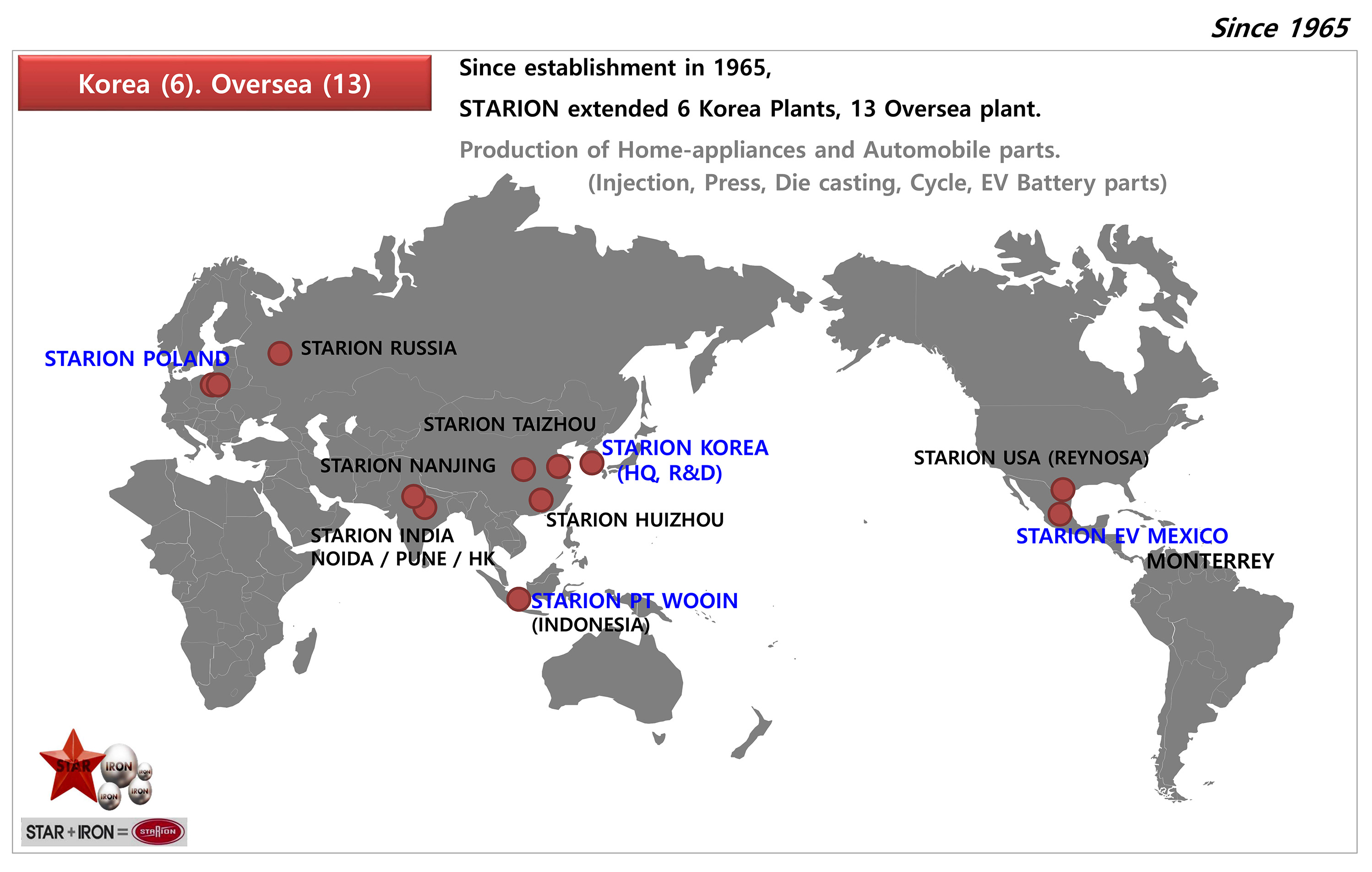 STARION ILWOO supports the development/production of automobile parts (injection, die casting, sheet metal, battery parts) and overseas subsidiaries in Starion Group